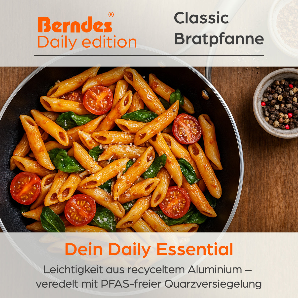 So schaffen wir Raum für eine Kollektion, die sich ganz auf das konzentriert, was viele im Alltag suchen: zuverlässige Pfannen und Töpfe in modernem Design – ganz ohne Kompromisse bei Sicherheit, Funktionalität und Nachhaltigkeit. Ob für den ersten eigenen Haushalt, als solide Küchengrundausstattung oder für alle, die es gerne unkompliziert mögen – die Berndes Daily Edition ist gemacht für jeden Tag.