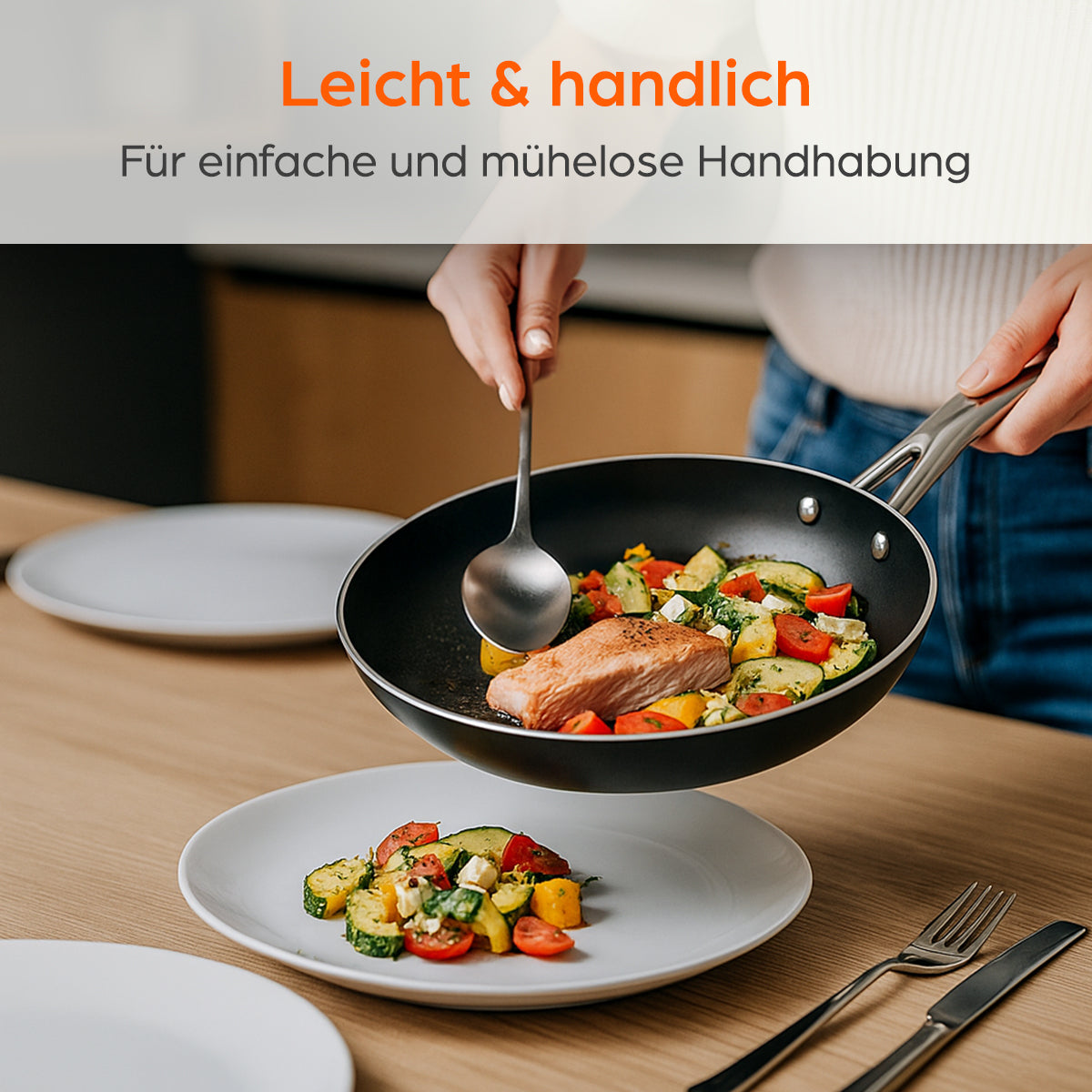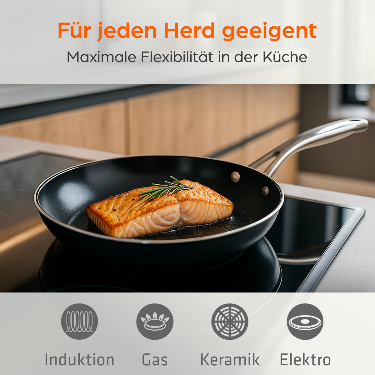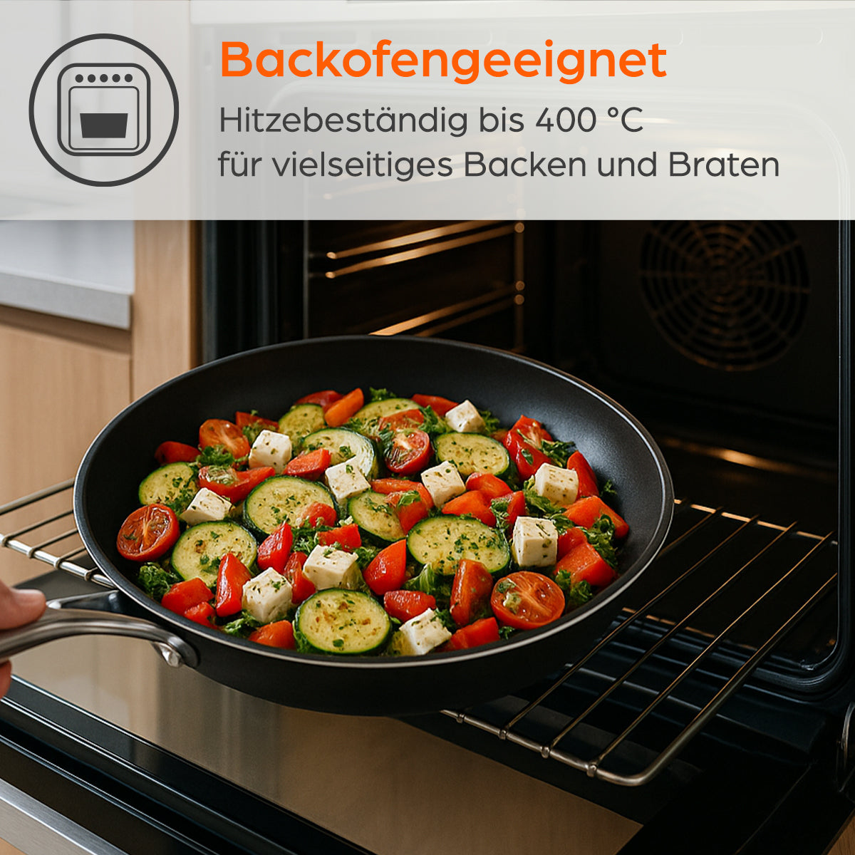 Auch in Sachen Hitzebeständigkeit überzeugt die Pfanne: Bis 400 °C einsetzbar und für alle Herdarten geeignet – inklusive Induktion. So bleibt sie ein zuverlässiger Begleiter in jeder Küche, egal ob beim schnellen Kochen im Alltag oder beim aufwendigen Menü.